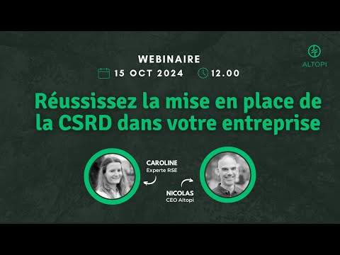 Comment mettre en place la CSRD au sein de votre entreprise ? Nicolas et Caroline, vous guideront à travers les étapes essentielles pour réussir la mise en œuvre de la CSRD ! Au programme : Les grands principes de la CSRD 📋 Les étapes incontournables à respecter 🛠️ Nos conseils pour s’organiser efficacement 💡 Comment engager vos collaborateurs ? 👥 En 45 minutes, vous repartirez avec les clés pour comprendre et mettre en œuvre la CSRD avec succès 💥 Voir la vidéo